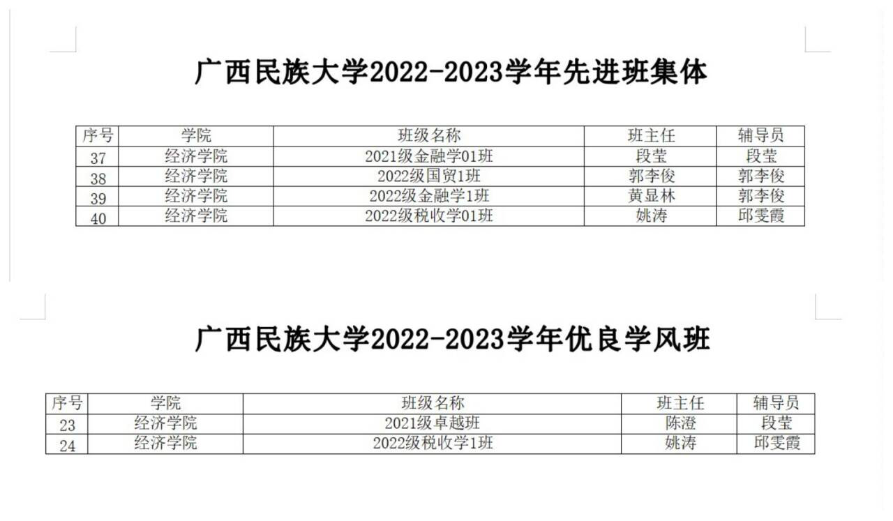 经济学院六个班级荣获“广西民族大学2022-2023学年先进集体和优良学风班级”的称号