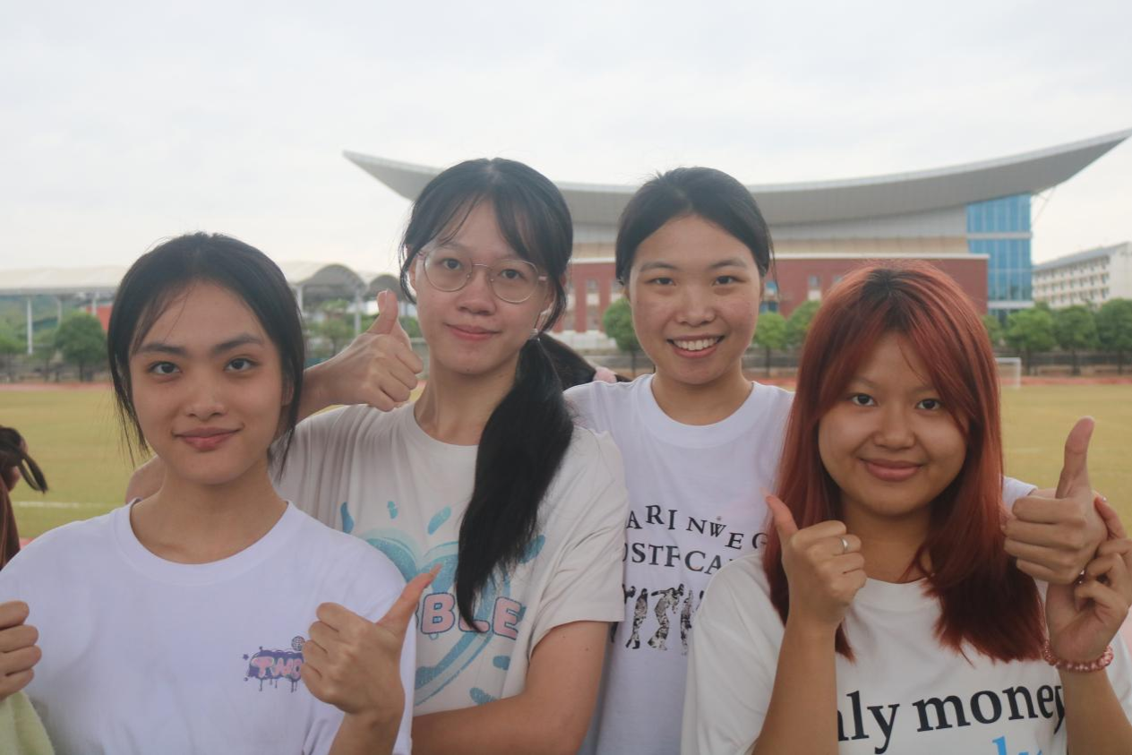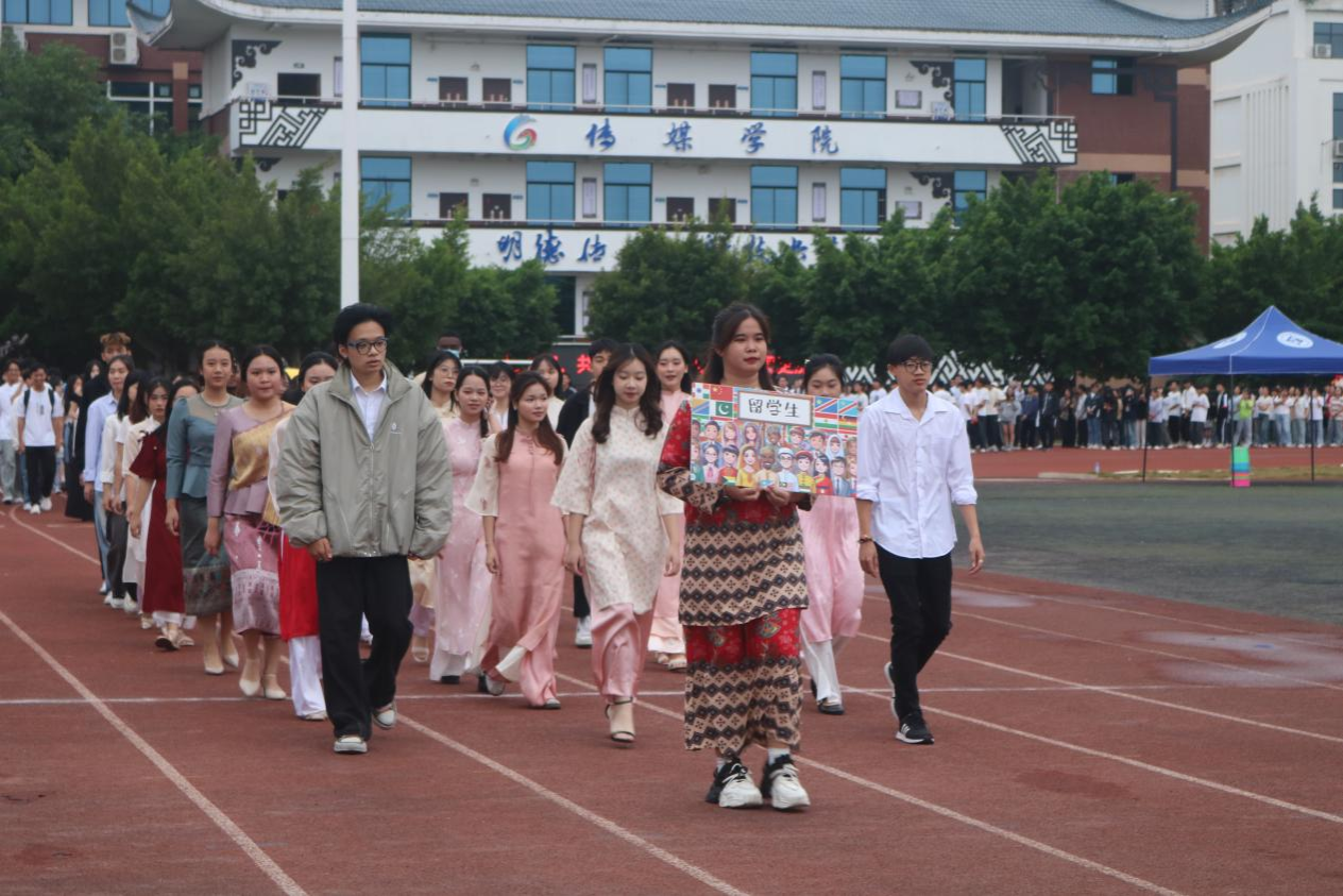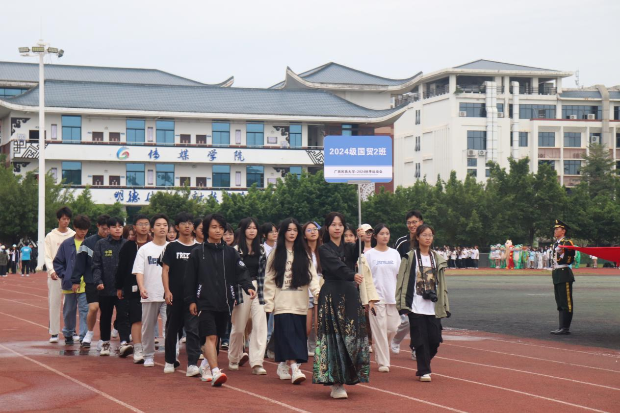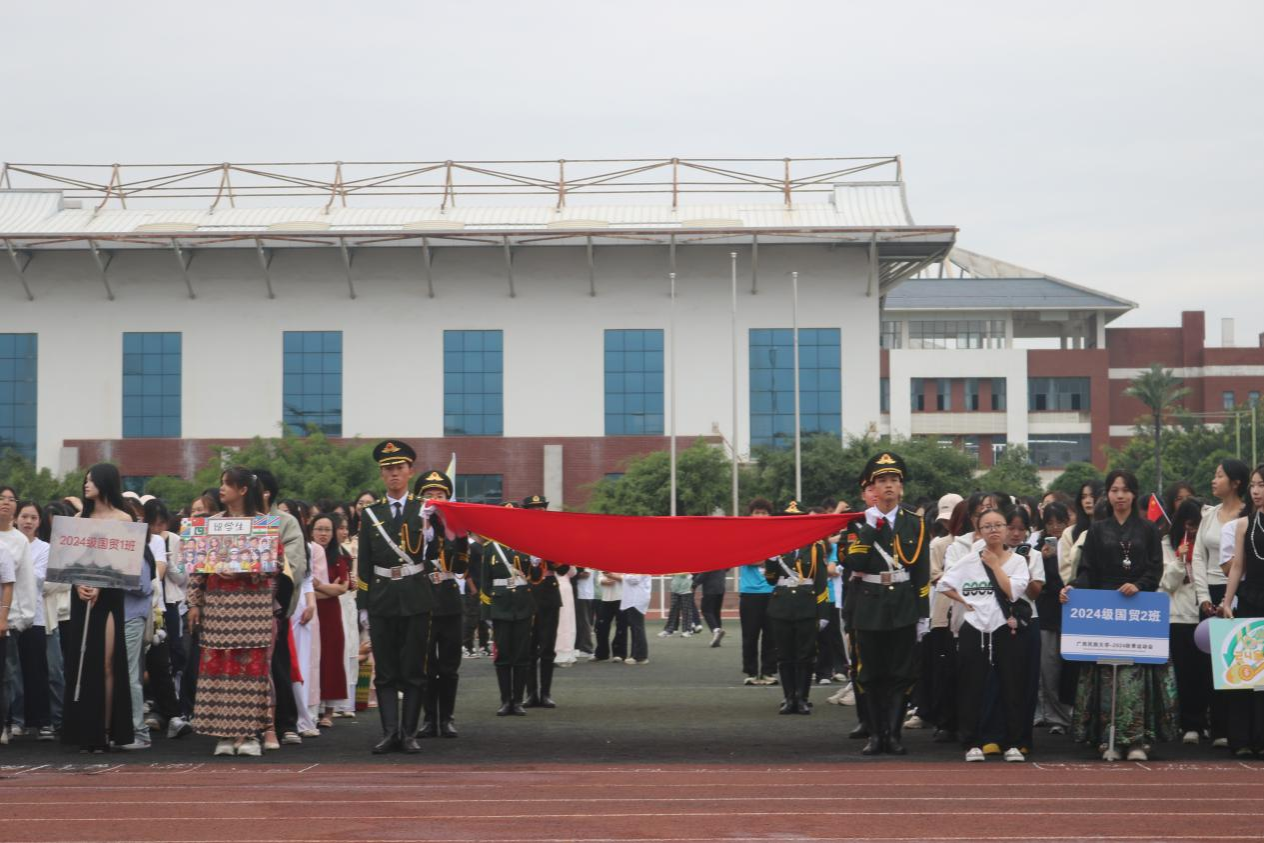 伴随着昂扬的进行曲,国旗队、院旗队踏着铿锵有力的步伐入场。随之而来的是裁判员方阵、留学生方阵、各班方阵。他们以丰富多彩的队形表演展示了大学生青春活力的模样。升旗仪式后,运动员代表2024级国际经济与贸易2班黄福秀、裁判员代表2024级国际经济与贸易1班陆洁媚上台发言宣誓。本次院运会在胡超宣布开幕中正式拉开帷幕。