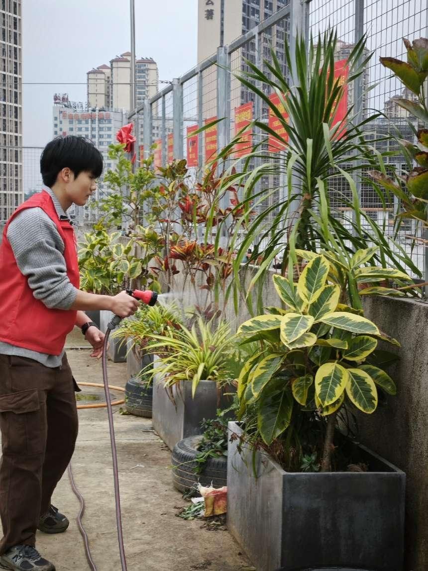 (志愿服务活动参与者帮特教空中花园植物浇水)