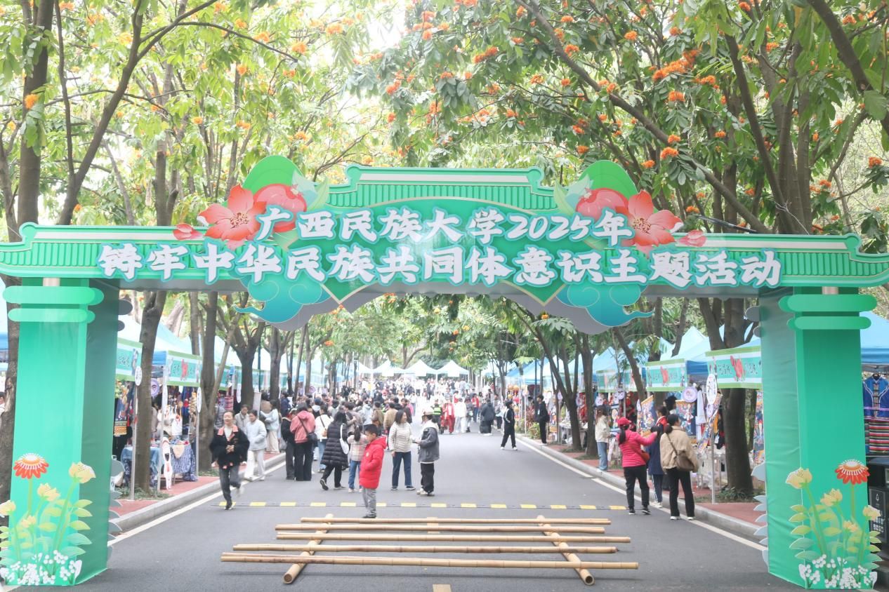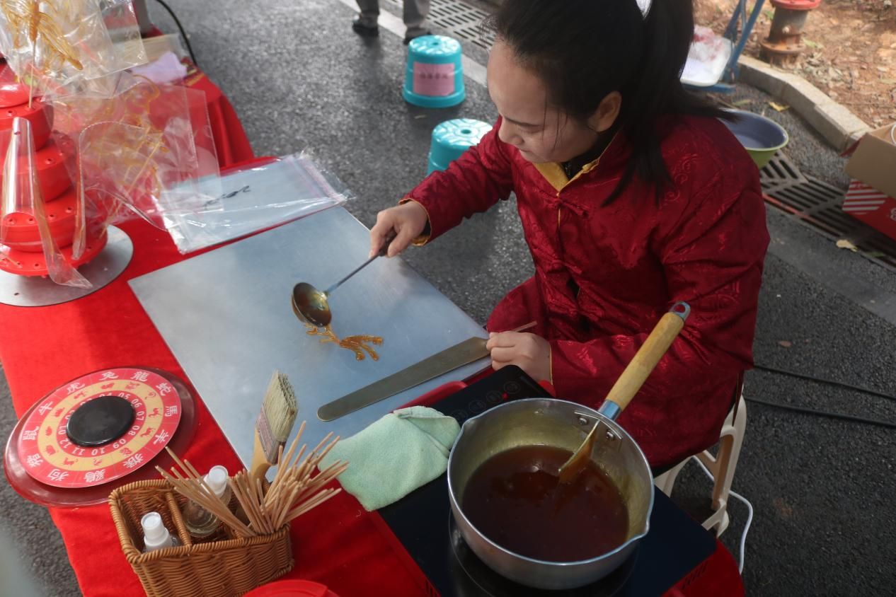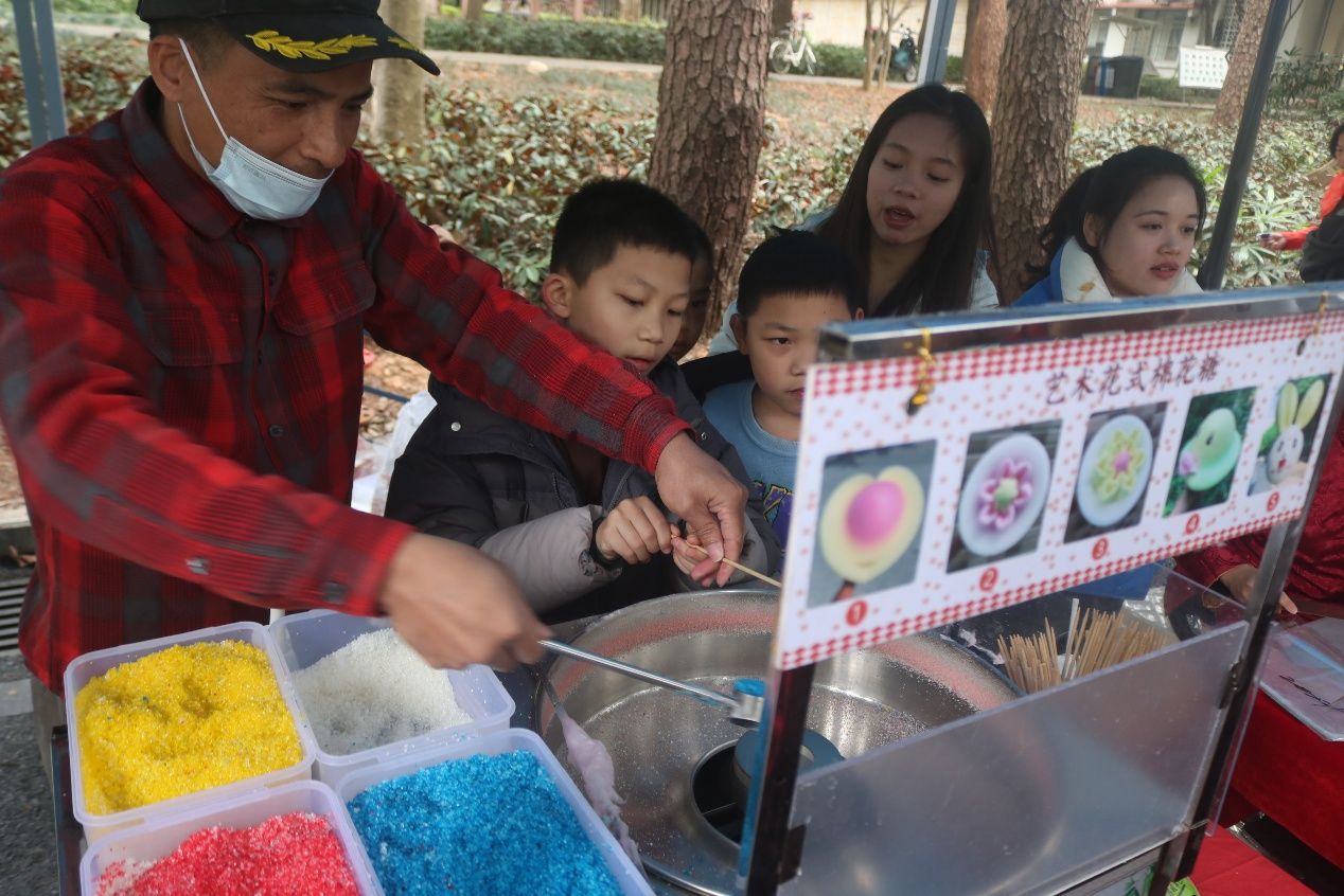 铸牢中华民族共同体意识主题活动现场上,fun88乐天使负责开展民族非遗制作活动,摊位设置了糖葫芦、棉花糖、麽乜制作等民俗体验项目,吸引师生踊跃参与。活动现场热闹非凡,同学们热情高涨,沉浸式体验丰富多彩的民族非遗制作。在棉花糖制作区域,五彩的糖在师傅手中变化为糖花,同学们认真观看和学习棉花糖的制作过程。在制作麽乜区域,师生们一同挑选壮族锦绣,精心裁剪、缝制。师生们在品尝美食和制作非遗工艺品中领略民族文化魅力。