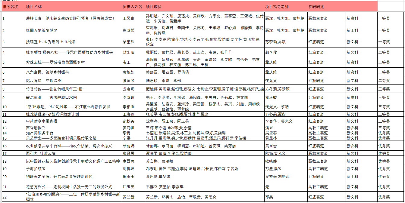 高斌副院长在赛前致辞,对同学们积极参与创新大赛表示肯定,同时鼓励更多的同学参与比赛,锻炼自己的创新能力。本次比赛分为路演演讲和评审答辩两个环节。经过激烈角逐,最终“蔗然成盒”、“纸周万物,纸争朝夕”、“扶瑶直上”三个项目获得一等奖,“桂乡狮舞,振兴八桂”、“紫珠流桂”、“八角富民,筑梦乡村振兴”、“咫尺青绿”四个项目获得二等奖,“竹香竹韵”等六个项目获得三等奖,“知识阁服务平台”等九个项目获得优秀奖。