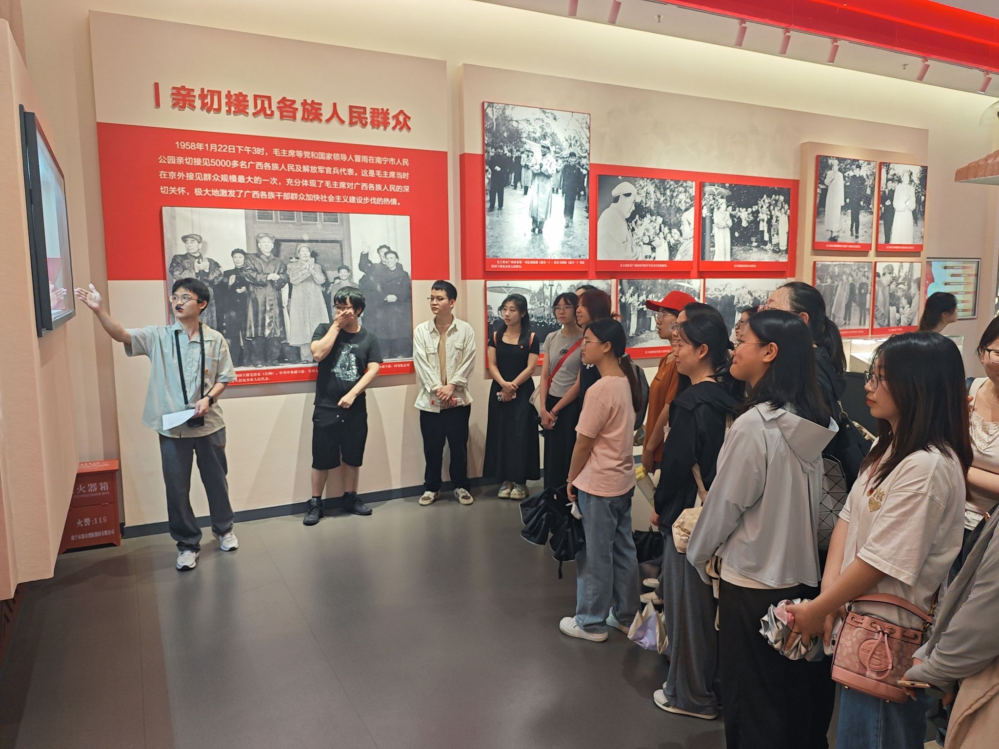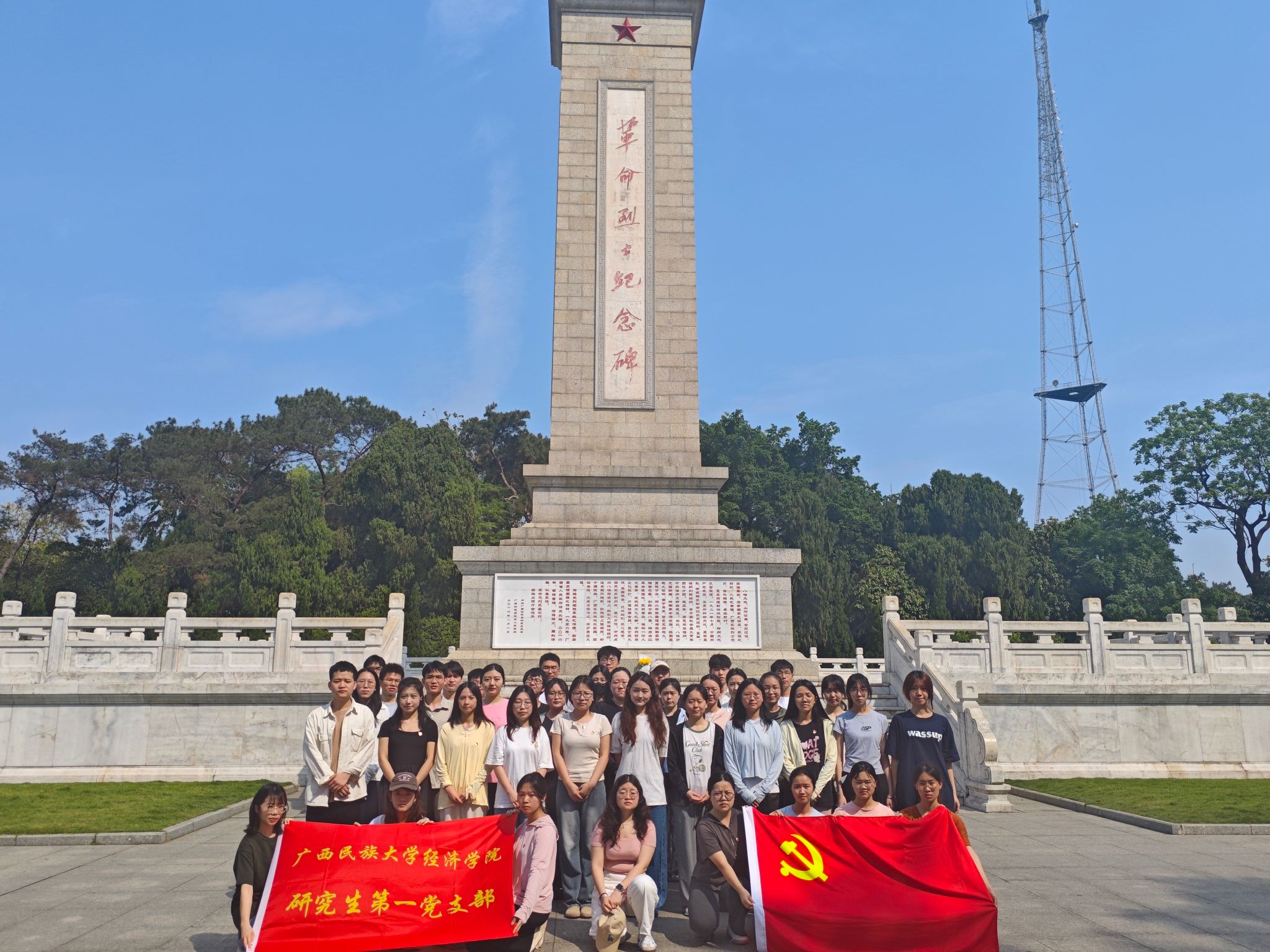 在革命烈士纪念碑前,师生鞠躬默哀,深切缅怀先烈。党支部书记黎靖老师结合革命历史,勉励同学们传承革命精神,坚定理想信念。随后,师生参观了毛主席接见广西各族人民纪念馆。