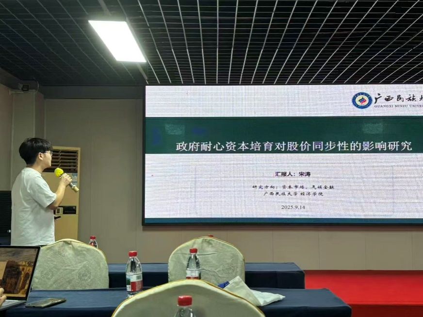 随后,宋涛以《政府耐心资本培育对股价同步性的影响研究》为主题进行了汇报,展示了耐心资本相关话题的研究成果,并探讨培育耐心资本对股票市场的影响。最后韦喜月就《ESG Report Sentiment Analysis and Environmental Violation Prediction of Chinese Listed Companies Based on FinBERT: Integrating Traditional Empirical and Machine Learning Methods》主题进行汇报,分享了其在AI金融方面的研究成果。