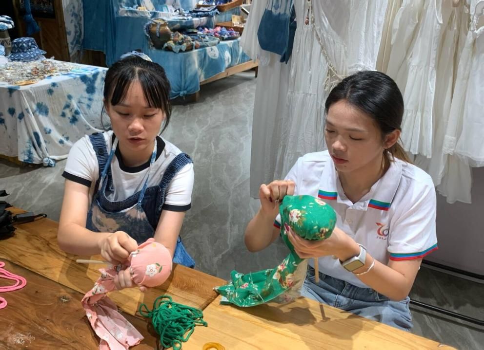 调研期间,“创宜”团队深入毛南相思非遗基地,观摩了毛南族传统扎染的制作流程,并与非遗传承人进行了面对面交流。传承人现场演示了如何将自然染料与古老纹样融入现代工艺品,强调了技艺中蕴含的民族历史与情感记忆。团队成员还亲自体验了传统漆扇与艾草锤的制作,感受非遗技艺的精细与独特魅力。